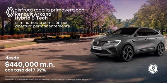 Celebra la primavera al volante del Renault Arkana Hybrid E-Tech, el SUV coupé que combina diseño elegante, tecnología híbrida y eficiencia. Como beneficio permanente, eliminamos la comisión por apertura en tu financiamiento. Adquiérelo con un precio desde $440,000 MXN y una tasa preferente del 7.99%. Innovación, confort y ahorro de combustible en cada viaje. Los precios pueden variar por modelo o versión.