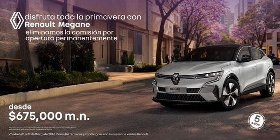 Celebra la primavera al volante del Renault Mégane, el sedán que combina diseño elegante, tecnología avanzada y confort superior. Como beneficio permanente, eliminamos la comisión por apertura en tu financiamiento. Adquiérelo con un precio desde $675,000 MXN y disfruta de 5 años de garantía para mayor tranquilidad. Sofisticación, rendimiento y seguridad en cada trayecto. Los precios pueden variar por modelo o versión.
