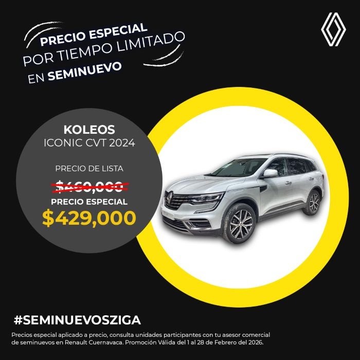 El precio mostrado ya incluye el bono aplicado. Válido únicamente para Renault Koleos Iconic CVT modelo 2024 seminuevo