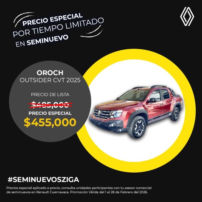 ¡Oferta especial por tiempo limitado! Adquiere la Renault Oroch Outsider CVT 2025 seminueva, una pickup de doble cabina que combina robustez, tecnología y versatilidad. Con un precio especial aplicado, consigue un vehículo casi nuevo, ideal para el trabajo y la aventura, con las ventajas de un seminuevo certificado. Potencia y estilo con un ahorro inteligente.
